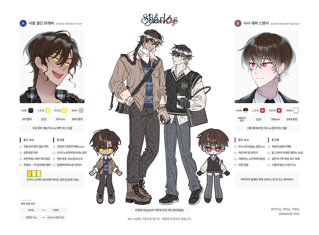 | 의상 | 가운데 의상 참고 (갈색 무스탕, 검은색 조끼 패션) 각 캐릭터 가방 제외해주세요. 복장 단순화 완전 OK |
