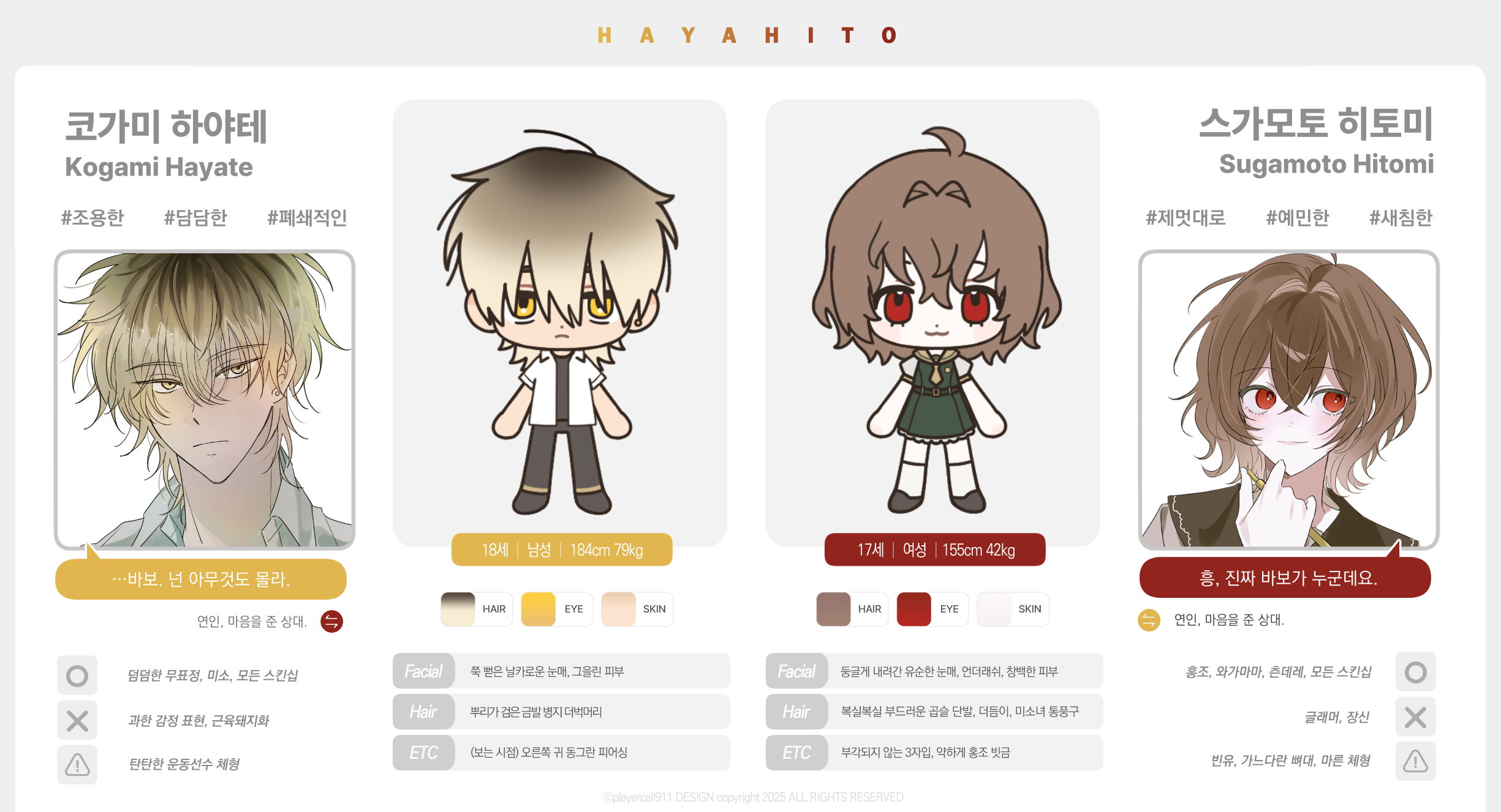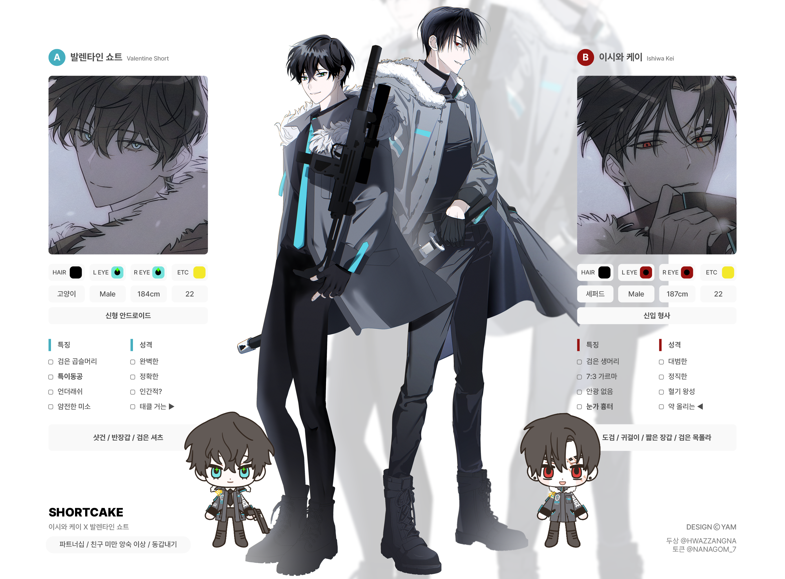 | 의상 키워드 | 가을 사복 신: 캐주얼하고 입기 편한 옷. 단추있는 옷은 꼭 하나 품. 자주 입는 건 티셔츠~후드나 야구점퍼 계열. 유우야: 주로 정장 계통. 단정한 옷차림. 단추 다 잠금. 자주 걸치는 건 코트류. 평상시 스타일은 위와 같습니다. 어느 정도 커플룩 분위기가 나면 좋겠지만 필수는 아닙니다. 고려하지 않고 자유롭게 입혀 주셔도 상관없습니다! 참고용으로만 생각해 주세요! |