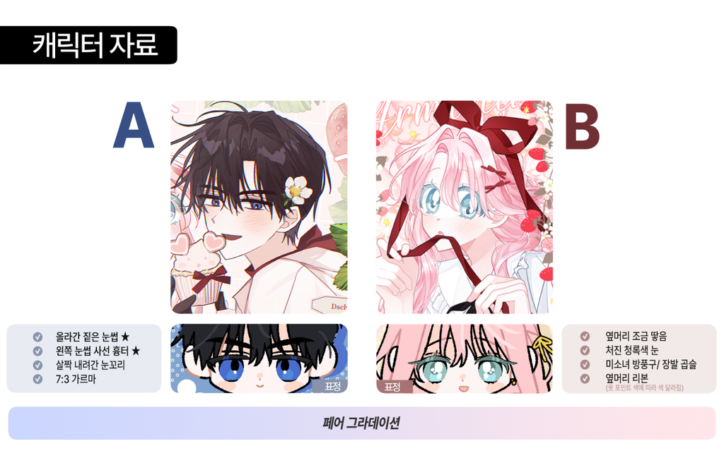 | 특이 사항 | 들고 있는 꽃 / 배경의 꽃은 붉은 장미로 변경 (꽃 품종 변경 불가 시 컬러만 변경해도 OK) 중앙 하트 유리병은 채도 낮은 와인으로 변경 그 외 배경 오브젝트는 캐릭터들 상징색으로 오마카세 기존 가을 타입보다 채도를 살짝 낮춰 주세요. |