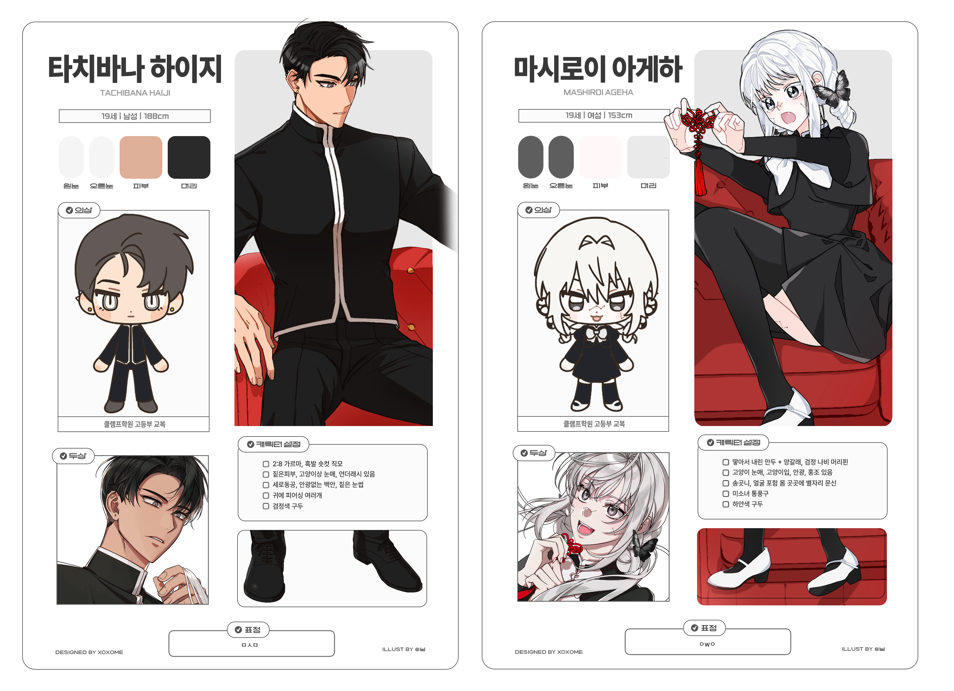 | 의상 키워드 | 블랙 + 레드 혹은 블루 + 화이트 캐쥬얼 사복 / 시밀러룩 |